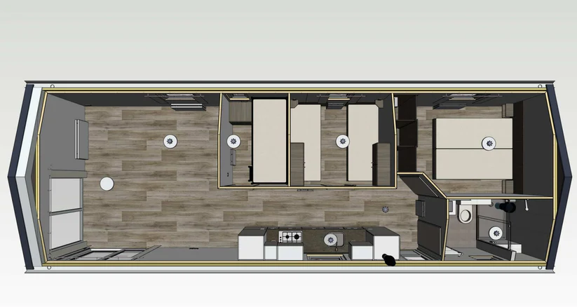 Descubra a Tinyhouse Neoglobo de 3 Quartos, uma solução habitacional espaçosa e versátil, projetada para oferecer o máximo conforto e funcionalidade. Com uma área generosa de 46m², esta casa móvel dispõe de três quartos e pode acomodar até 5 pessoas. A sua estrutura robusta e bem isolada garante um ambiente acolhedor em todas as estações do ano. A configuração sem mobília oferece total liberdade de personalização, permitindo-lhe criar um espaço perfeito, totalmente ao seu gosto e necessidades. Tinyhouse Neoglobo: Espaço amplo, conforto e liberdade para personalizar.